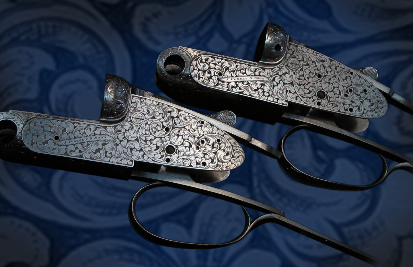 Na angielskim rynku broni często pojawiają się dubeltówki w zestawach - dwóch czasami trzech egzemplarzy, identycznie wykonanych strzelb, nazywane "sisters shotgun". Na bogatych w ptactwo polowaniach, aby móc szybko oddawać kolejne strzały, myśliwy miał, ma asystenta, dawniej lokaja, który ładuje broń i podaje myśliwemu. Dodam od siebie, że automat śrutowy na prestiżowym angielskim polowaniu byłby bardzo, ale to bardzo nie na miejscu. Na zdjęciu identycznie wygrawerowana przeze mnie para dubeltówek Firmy J. Purdey & Sons w ornamencie nazywanym "Bold scroll"
